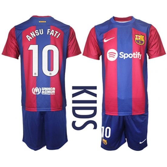 >Youth Barcelona #10 Ansu Fati Blue Red 2023-24 Home Soccer Jersey