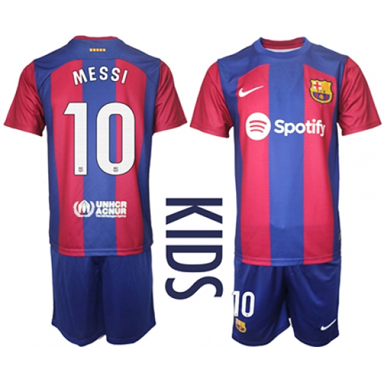 >Youth Barcelona #10 Messi Blue Red 2023-24 Home Soccer Jersey