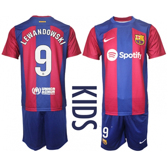 >Youth Barcelona #9 Lewandowski Blue Red 2023-24 Home Soccer Jersey