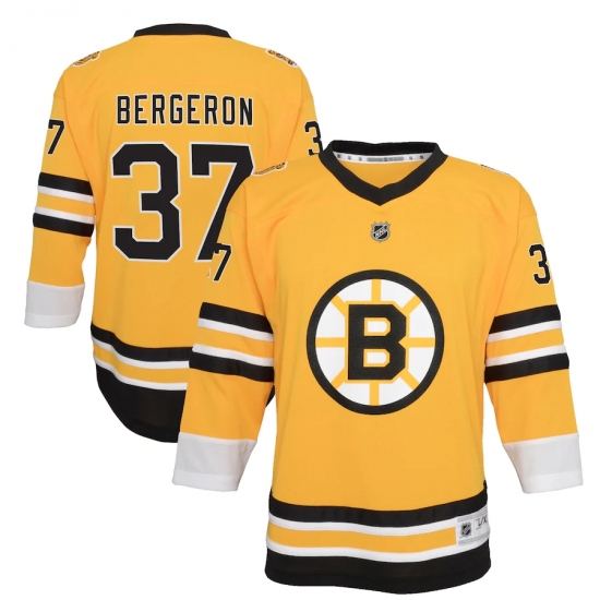 >Youth Boston Bruins #37 Patrice Bergeron Yellow 2020-21 Special Edition Replica Player Jersey