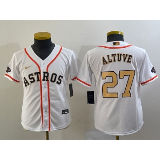 >Youth Houston Astros #27 Jose Altuve 2023 White Gold World Serise Champions Cool Base Stitched Jersey