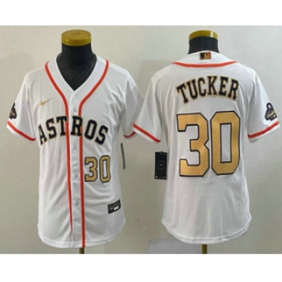 >Youth Houston Astros #30 Kyle Tucker Number 2023 White Gold World Serise Champions Cool Base Stitched Jerseys