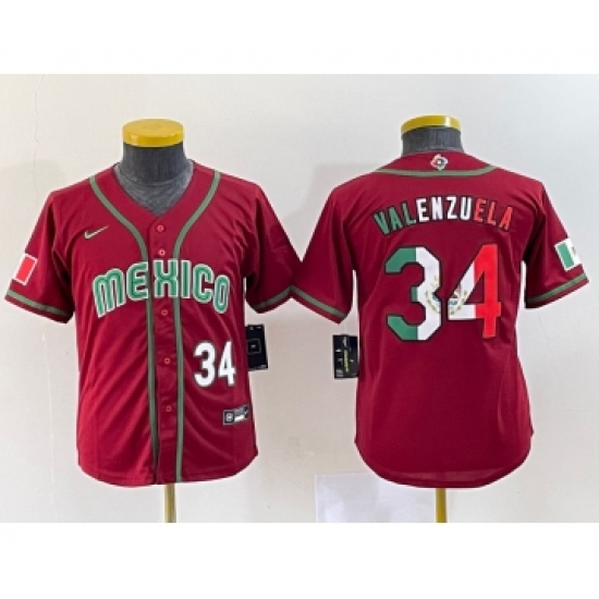 >Youth Mexico Baseball #34 Fernando Valenzuela 2023 Red World Classic Stitched Jersey