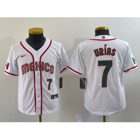 >Youth Mexico Baseball #7 Julio Urias Number 2023 Red World Baseball Classic Stitched Jersey 3