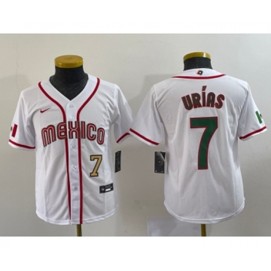 >Youth Mexico Baseball #7 Julio Urias Number 2023 Red World Baseball Classic Stitched Jersey