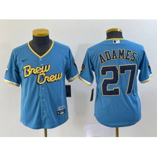 >Youth Milwaukee Brewers #27 Willy Adames Blue 2022 City Connect Cool Base Stitched Jersey