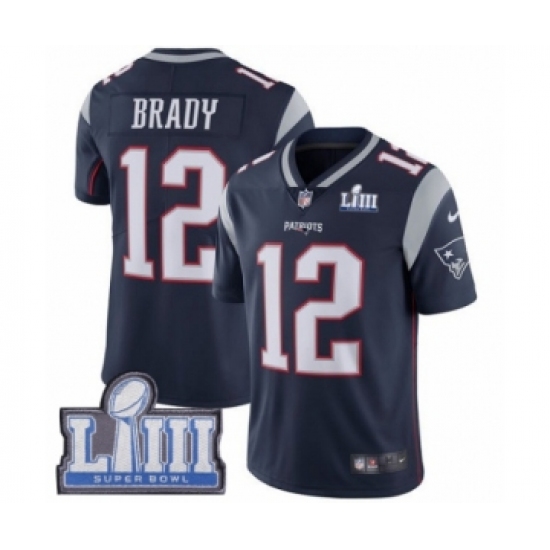 >Youth Nike New England Patriots #12 Tom Brady Navy Blue Team Color Vapor Untouchable Limited Player Super Bowl LIII Bound NFL Jersey