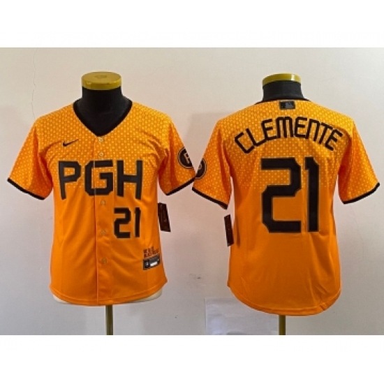Youth Nike Pittsburgh Pirates #21 Roberto Clemente Number Yellow 2023 City Connect Stitched Jersey2