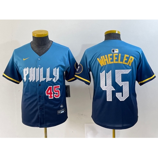 >Youth Philadelphia Phillies #45 Zack Wheeler Blue 2024 City Player Number Cool Base Stitched Jerseys