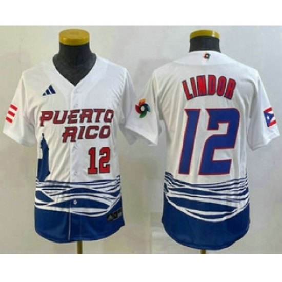 >Youth Puerto Rico Baseball #12 Francisco Lindor Number 2023 White World Baseball Classic Stitched Jersey