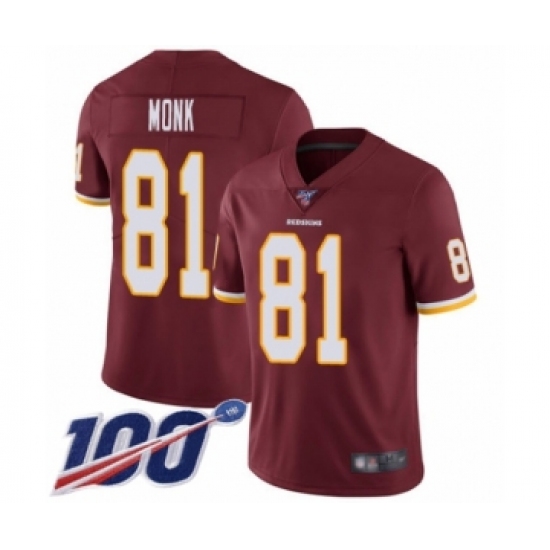 >Youth Washington Redskins #81 Art Monk Burgundy Red Team Color Vapor Untouchable Limited Player 100th Season Football Jersey