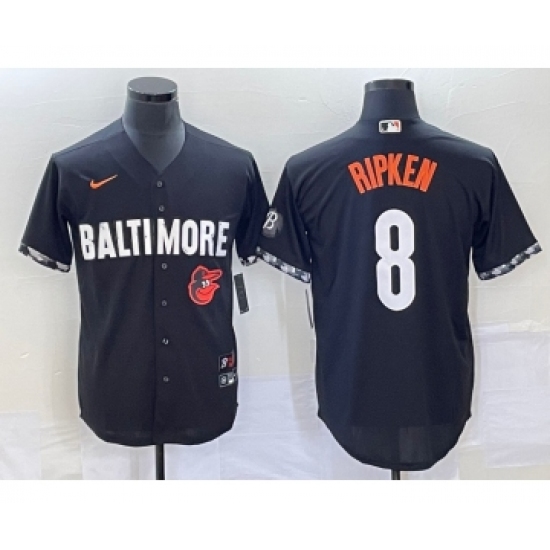 >Men's Baltimore Orioles #8 Cal Ripken Jr Black 2023 City Connect Cool Base Stitched Jersey 1