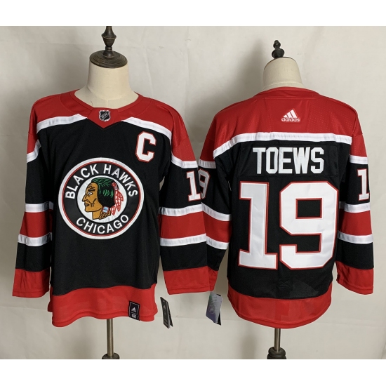 Men's Chicago Blackhawks #19 Jonathan Toews Red Black 2022 Reverse Retro Stitched Jersey