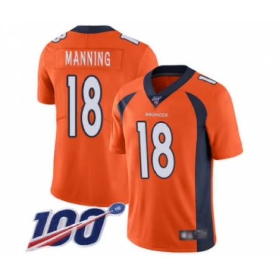 Men's Denver Broncos #18 Peyton Manning Orange Team Color Vapor Untouchable Limited Player 100th Season Football Jersey