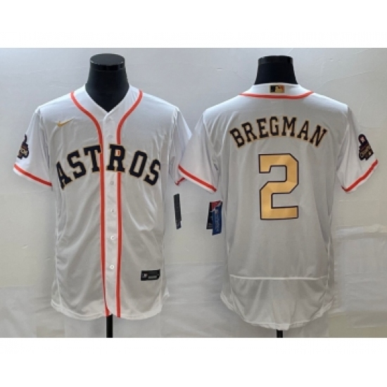 >Men's Houston Astros #2 Alex Bregman 2023 White Gold World Serise Champions Flex Base Stitched Jersey