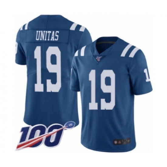 >Men's Indianapolis Colts #19 Johnny Unitas Limited Royal Blue Rush Vapor Untouchable 100th Season Football Jersey