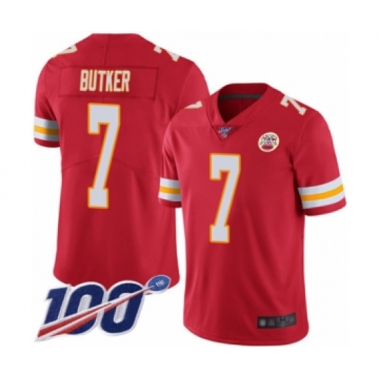 >Men's Kansas City Chiefs #7 Harrison Butker Red Team Color Vapor Untouchable Limited Player 100th Season Football Jersey