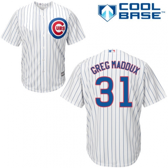 Home>MLB>Chicago Cubs>Greg Maddux>Men's Majestic Chicago Cubs #31 Greg Maddux Replica White Home Cool Base MLB Jersey