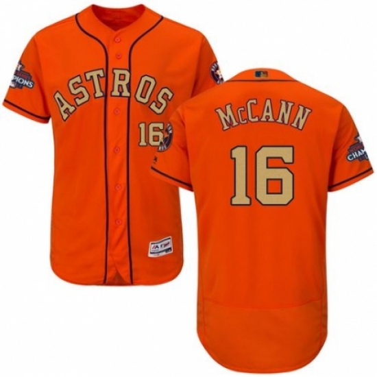 >Men's Majestic Houston Astros #16 Brian McCann Orange Alternate 2018 Gold Program Flex Base Authentic Collection MLB Jersey