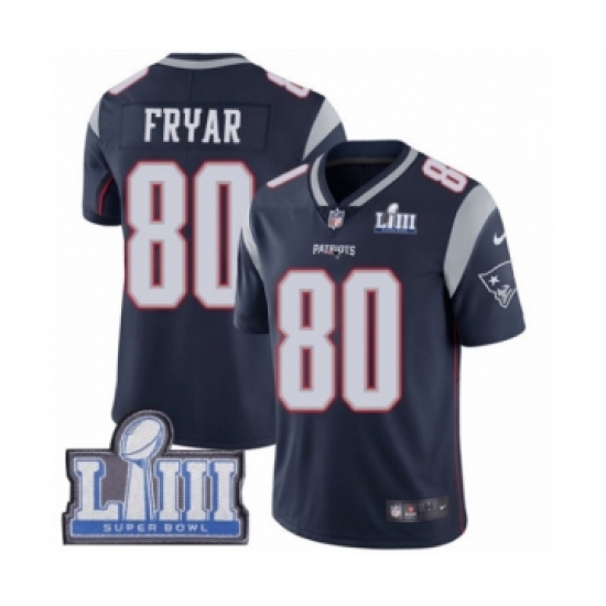 >Men's Nike New England Patriots #80 Irving Fryar Navy Blue Team Color Vapor Untouchable Limited Player Super Bowl LIII Bound NFL Jersey