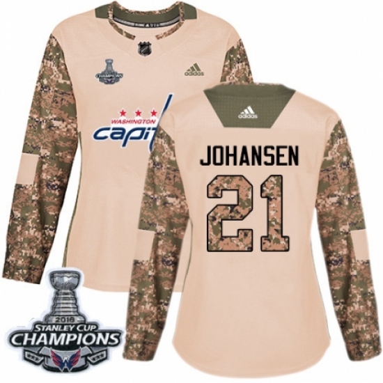 Women's Adidas Washington Capitals #21 Lucas Johansen Authentic Camo Veterans Day Practice 2018 Stanley Cup Final Champions NHL Jersey