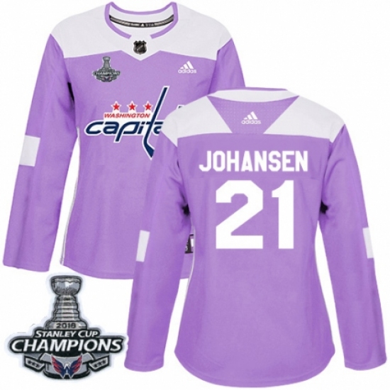 >Women's Adidas Washington Capitals #21 Lucas Johansen Authentic Purple Fights Cancer Practice 2018 Stanley Cup Final Champions NHL Jersey
