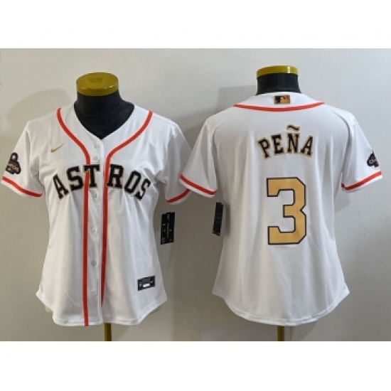 >Women's Houston Astros #3 Jeremy Pena 2023 White Gold World Serise Champions Cool Base Stitched Jersey