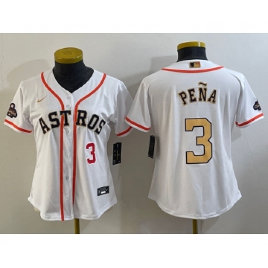 >Women's Houston Astros #3 Jeremy Pena Number 2023 White Gold World Serise Champions Cool Base Stitched Jerseys