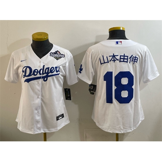 >Women's Los Angeles Dodgers #18 山本由伸 White 2025 World Series Home Cool Base Stitched Baseball Jersey(Run Small)