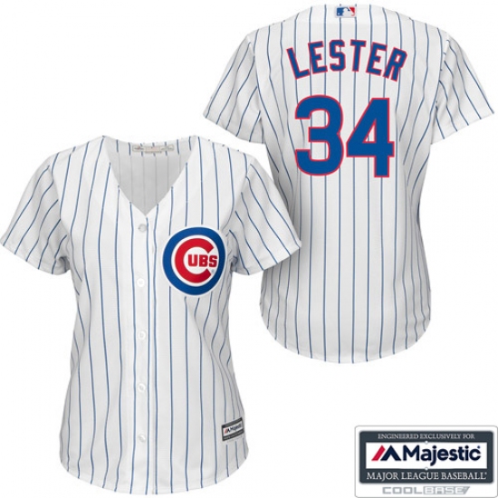 Home>MLB>Chicago Cubs>Jon Lester>Women's Majestic Chicago Cubs #34 Jon Lester Replica White/Blue Strip Fashion MLB Jersey