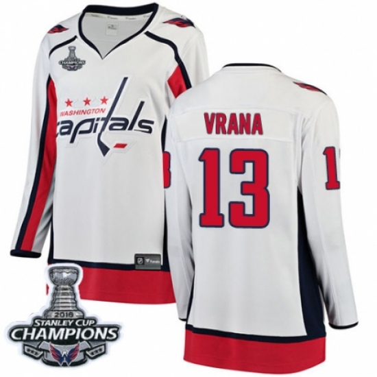 >Women's Washington Capitals #13 Jakub Vrana Fanatics Branded White Away Breakaway 2018 Stanley Cup Final Champions NHL Jersey