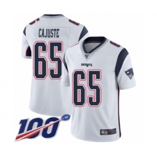 >Youth New England Patriots #65 Yodny Cajuste White Vapor Untouchable Limited Player 100th Season Football Jersey