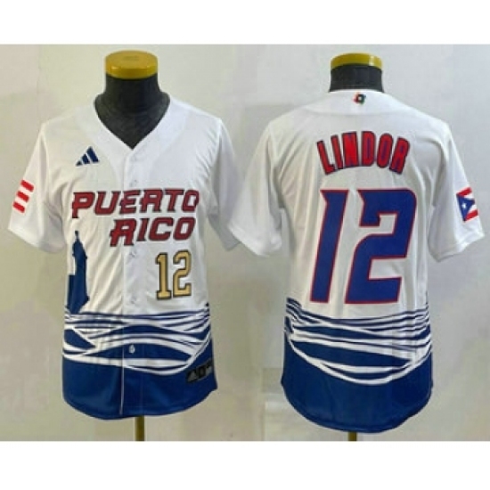 >Youth Puerto Rico Baseball #12 Francisco Lindor Number 2023 White World Baseball Classic Stitched Jersey1