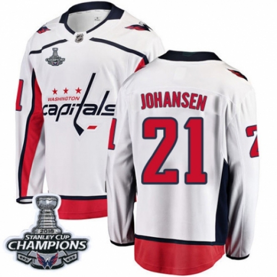 >Youth Washington Capitals #21 Lucas Johansen Fanatics Branded White Away Breakaway 2018 Stanley Cup Final Champions NHL Jersey